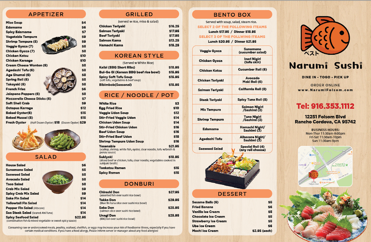 Welcome to Narumi Sushi, a delightful culinary oasis located in Rancho Cordova, California. Nestled at 12251 Folsom Blvd, Narumi Sushi promises an exceptional dining experience that expertly blends traditional Japanese flavors with modern innovation. Whether you're a sushi aficionado or a casual diner, this restaurant is designed to enchant your taste buds.