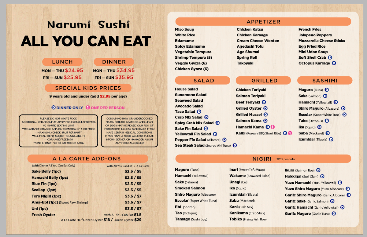 Vegetarians and health-conscious diners will also find bliss at Narumi, with appetizing options like the Vegetable Tempura and Agedashi Tofu. The medley of flavors in these dishes is utterly satisfying, ensuring that everyone leaves happy and full. Garth Epling-Card captures the essence well, mentioning the lively atmosphere and promising all-you-can-eat offerings that make Narumi a must-visit!